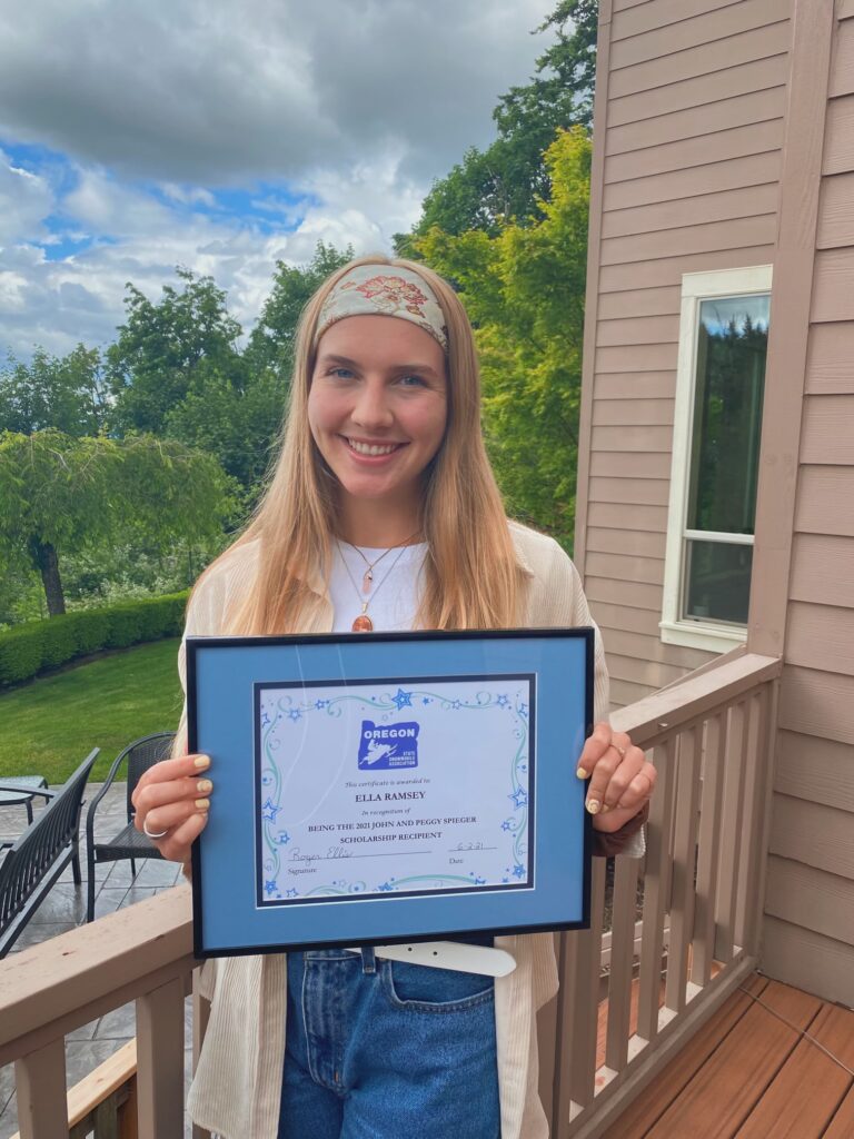 Congratulations to Ella Ramsey our 2021 winner of the John and Peggy Spieger Scholarship.  This is our first year of giving this Scholarship and we are honored to give it to such a deserving young lady.  Ella has chosen to study engineering at Oregon State University, with a minor in Spanish and/or business.  She was a very active student in school in sports having lettered in Varisty Track and Field and Soccer Awards four years in a row for each sport, Student of the Month for 2019 and 2020 an Oregon DECA Sports and Entertainment Marketing Event placing 2nd for 2020 and 4th place for 2021.  She also played competitive club soccer for 6 years.  She has participated in community service by volunteering at Solve Volunteer Cleanups (forest, roads, etc), packaged Army Blessing Boxes, KidsWorks After School Program and SBHS Friends of Freshman Program.  We wish her great success in her future endeavours and wish her the best of luck.