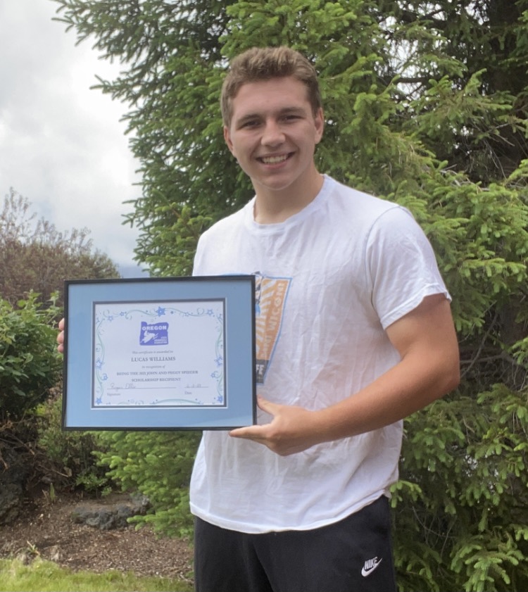 Congratulations to Lucas Williams who was selected to receive the second John and Peggy Spieger Scholarship Award.  He will be attending Oregon State University Cascades and Central Oregon Community College.  Lucas plans to Major in Biology and Physical Therapy.  He has Lettered in Varsity Football all 4 years, was a peer math tutor, a member of the Interact Club, a Volunteer Assistant coach for football and wrestling and a Special Olympics peer mentor.  He was a member of the Cultural Exploration Club an the Interact Club.  His community service includes Christmas Charity Baskets for the Bend Elks Club, Habitat for Humanity, Ghost Tree Charity Fundraiser and a Special Olympics Peer Mentor Program, Youth Football Camps Volunteer Coaching Assistant, Pilot Butte Middle School Wrestling Volunteer Assistant Coach and Peer Mathematics Tutor.  He has been outstanding in sports during his High School Years.  He is a 3 time Mountain Valley Conference Football and Wrestling All-Academic Team, Mountain Valley Conference Wrestling All Conference Award, 3 time Varsity Letter in Football, Wrestling, Rugby and Academics each year.  He has been the MVHS Student of the Month, 2 time COCC Mathematics Competitor, MVHS Department Award in Social Studies and Foreign Language, 2021 All City Center and Linebacker and was nominated for the NNF Award.  During his high school years he was employed by the Blue Moon Ranch as a Farm Hand.  Lucas is a hard working young man and we are proud to be able to give this scholarship to him to help further his future.  We wish him the best.
